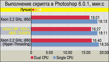 Как ни странно, редкостную "непритязательность" продемонстрировал Adobe Photoshop — его результаты для всех платформ практически одинаковы. А в общем и целом становится уже довольно очевидным следующий эмпирическим путем выявленный факт: ни пропускная способность подсистемы памяти, ни чипсет, ни какие-то "хитрые" функции CPU на производительность в задачах рендеринга коренным образом не влияют. А влияют банальная частота работы ядра и количество исполняющих блоков. Это, конечно, грубое сравнение, но можно сказать так: если бы существовал Pentium III, работающий, к примеру, на частоте 3 GHz, то еще неизвестно, кто бы стал победителем в таких приложениях — новомодные и прогрессивные Athlon MP и Xeon или же такой вот "высокочастотный старичок".