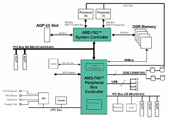 Даже при беглом взгляде на сравнительную таблицу видно, что первый SMP-чипсет этой компании "вырос" именно из предыдущего AMD-760 (а он, в свою очередь, был первым набором микросхем AMD с поддержкой DDR SDRAM). Фактически северный мост AMD-762 — это AMD-761, которому добавили IOAPIC и вторую процессорную шину с необходимой "обвязкой", а контроллер PCI 32-bit/33 MHz заменили на PCI 64-bit /66 MHz. Быть может, кто-то спросит: "Как это PCI 64/66? Ведь чипсет AMD-760MP поддерживает только 33-мегагерцевую PCI 64-bit?". Однако если присмотреться к таблице повнимательнее, становится ясно, что северный мост в данном случае ни при чем: частота 33 MHz обусловливается не его возможностями, а требованием самой шины. Требование это состоит в том, что все устройства должны работать на одной частоте. Поэтому поддержка PCI 64/66 в AMD-760MP оказывается незадействованной из-за того, что 66 MHz не поддерживает южный мост чипсета — AMD-766.