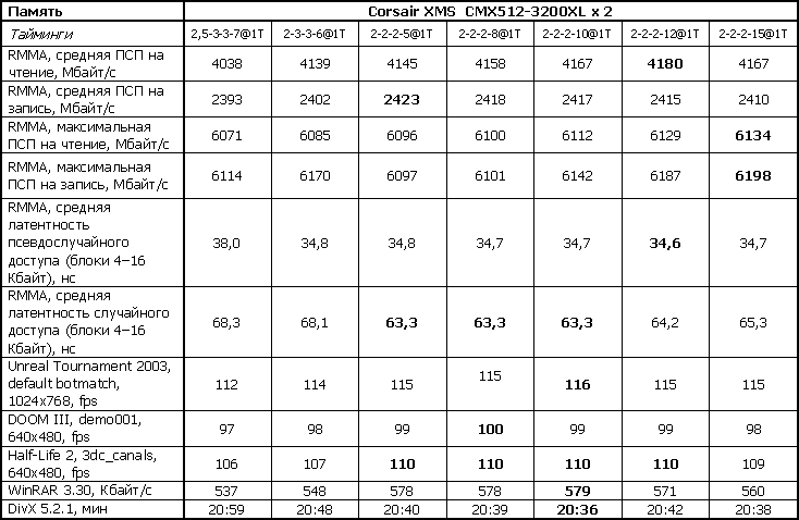 Результаты не требуют пространных комментариев. Совершенно очевидно, что вне зависимости от степпинга процессорного ядра, целесообразно выбирать вариант с максимальной частотой. Кроме скоростного преимущества, такой вариант отличается и большим запасом надежности. Так в качестве эксперимента были установлены два 1-гигабайтных модуля Kingston ValueRAM вперемешку с парой 512-мегабайтных Corsair XMS. И эта диковинная смесь работала без каких-либо замечаний с таймингами 2,5-2-4-8 как на «новом», так и на «старом» ядре в режимах с 2T-задержкой. Работала она и на частоте 333 МГц и 1T-задержке на системе с ядром Venice, но вот для стабильности первого режима (частота 200 МГц — 1T) на ядре Winchester потребовалось поднять тайминги до 3-3-3-8.