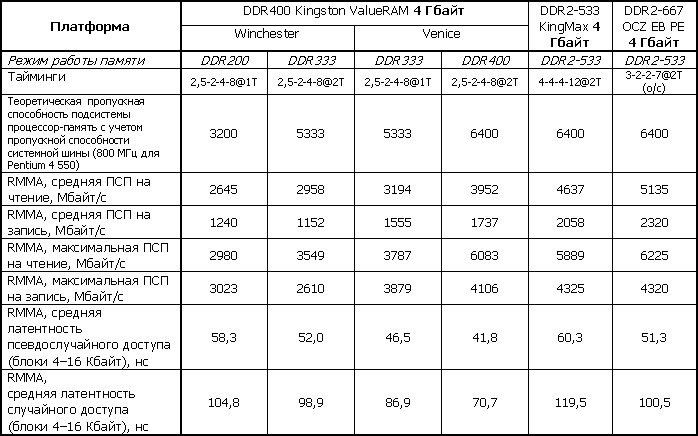 Для сравнения был собран стенд с дискретным контроллером (материнская плата MSI 925X Neo на чипсете i925X, процессор Pentium 4 550) и двумя комплектами памяти — из четырех модулей DDR2-533 KingMax KMX128DD64-533 по 1 Гбайт и DDR2-667 EB DC Platinum OCZ26672048EBDCPE-K в виде двух комплектов по два 1-гигабайтных модуля каждый. В первом комплекте стандартные тайминги соответствуют типичному (и закрепленному в стандарте) для массовой DDR2-533 сочетанию 4-4-4-12, во втором — прописанное в SPD значение оказалось 4-2-2-8, но модули стабильно работали и с таймингами 3-2-2-7, на которых и тестировались для получения "максимального" результата. Аналогом параметра 1T/2T Memory Timings для дискретных контроллеров традиционно является 1T/2T Command Rate, в настоящее время он практически не встречается в BIOS материнских плат на интеловских чипсетах и заблокирован по умолчанию на значении 2T. Кстати, в BIOS плат на чипсете nForce4 SLI IE этот параметр снова «вытащен на свет», но пока возможность перевести его в 1T касается лишь элитной памяти и лишь случаев минимального заполнения банков («витринный» пример — память Corsair XMS2-5400 с заявленными таймингами 3-2-2-8-1T).