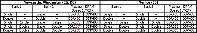 В системы на первых ревизиях Athlon 64 под Socket 939 для работы на максимальной частоте (DDR400) можно было установить только пару модулей (одно- или двусторонних 1), что на практике означало суммарный объем не более 2 Гбайт. И, например, если нам требовалось набрать 3 Гбайта (для сохранения двухканального режима работы его можно получить установкой пары двусторонних модулей по 1 Гбайту и пары односторонних по 512 Мбайт) требовалось корректировать множитель, превращая память в DDR200.