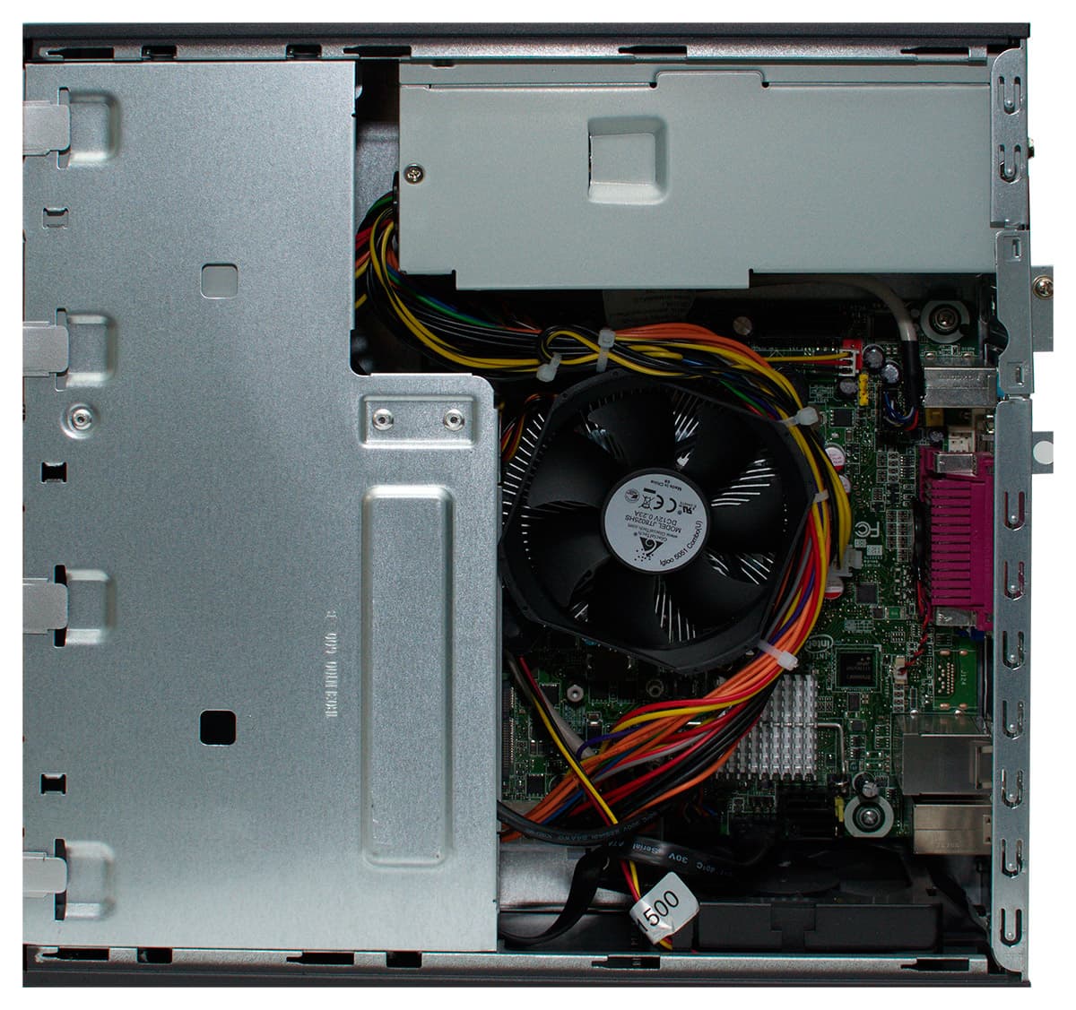 Аккуратной сборке с использованием «затяжек» нынче научились практически все, поэтому ставить её в заслугу производителю сейчас уже вряд ли стоит — просто констатируем, что она в наличии. В корпусе тесновато, но это обуславливается его размерами. В остальном... да ничего особенного, в принципе. В рамках использованного набора комплектующих компьютер собран как должно. Пожалуй, единственная придирка: желающим установить в качестве апгрейда оптический привод, рекомендуется внимательно посмотреть на фото: привод вам понадобится очень короткий (или придётся заменить кулер на более низкий).