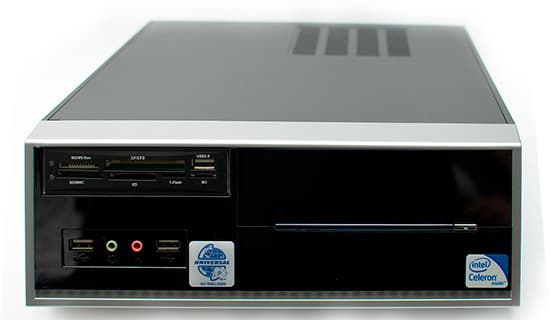 Глянцевая панель кому-то нравится, кому-то — нет, но это скорее вопрос вкуса. А вот наличие картридера — несомненный плюс, тем более что на нём размещён ещё один (третий — два на корпусе) разъём USB. Внешне компьютер смотрится достаточно строго, что для офисной системы скорее плюс, чем минус. Внутренний эстет, намертво интегрированный в автора, про себя пробурчал, что место для наклейки «Компьютерного Мира», выбрано не очень удачно — но вряд ли люди, которые пришли на рабочее место (то есть, по идее, работать), придадут значение таким мелочам.