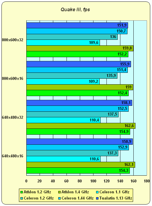 Тест в большей степени на скорость текстурирования, и четко видно, что начиная с определенной частоты, скорость процессора в нем уже не важна. А вот производительность подсистемы памяти дает о себе знать, и в данном случае — проигрышем всех процессоров Intel. Сюда бы Pentium 4 с его 3.2 GB/sec двухканальной RDRAM — вот он бы всем показал! :) Ну а Tualatin и Celeron, довольствующиеся PC133, можно сказать, "не виноваты" — их проигрыш обусловлен не производительностью самих процессоров, а использованием PC2100 DDR на системах с Athlon. Впрочем, поправимся — Athlon с его 266 MHz FSB еще и способен утилизовать такую память, чего CPU на ядре P6 сделать не могут — полоса пропускания их шины равна полосе пропускания именно PC133, и не более.