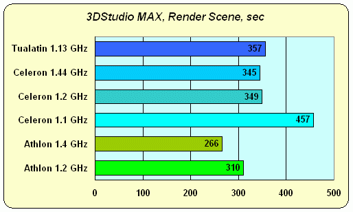 Разница между различными процессорами Intel видна, и Tualatin с его большим кэшем и 133 MHz FSB опять на высоте — он обгоняет даже Celeron 1.44 GHz. Да уж, совершенно четко видно, что для профессиональных приложений даже самый "навороченный" и высокочастотный Celeron мало подходит. Но, увы — даже Tualatin, видимо, "упирается" еще и в память, поэтому абсолютным чемпионом опять выходит Athlon.