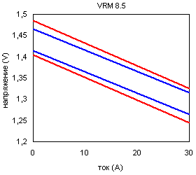 Где синим обозначен коридор Vcore для статической нагрузки, а красным — для резких изменений. Как вы видите, такое понятие как Vcore в VRM 8.5 практически исчезло! Значение напряжения питания ядра больше не является постоянным. Вместо этого предлагается построение так называемой нагрузочной прямой (Load Line), где выдаваемое VRM напряжение линейно зависит от потребляемого процессором тока. А выводы VID процессора теперь задают некоторое базовое значение Vcore, определяющее смещение коридоров по высоте. Как показали исследования Intel такое решение во первых легко реализуемо (даже на основе существующих микросхем управления VRM), а во вторых оно является более подходящим для ядра на основе технологии 0.13, чем постоянное напряжение питания.