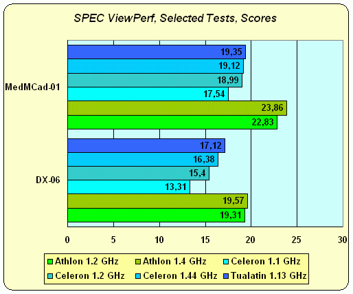 А вот в этом подтесте явно главное — частота и… видимо, "Pentium-ориентированность" приложения (читай — наличие поддержки SSE). Даже самый слабенький Celeron обогнал Athlon 1.2 GHz, а одинаковый по частоте с Athlon 1.4 GHz Celeron идет с ним наравне. Tualatin — в хвосте, что еще раз подчеркивает что размер кэша в подтесте Dragothic несущественен.