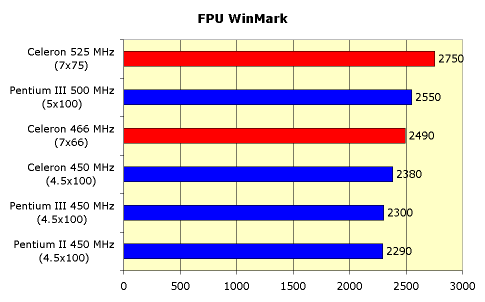 Здесь показатели еще более радостные для владельцев разогнанного Celeron 300A. Даже разогнанный Celeron 466 не дотягивает до Celeron 450, работающего с 100-мегагерцовой шиной.