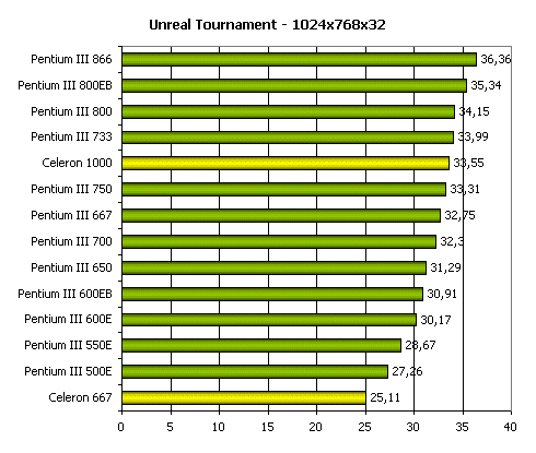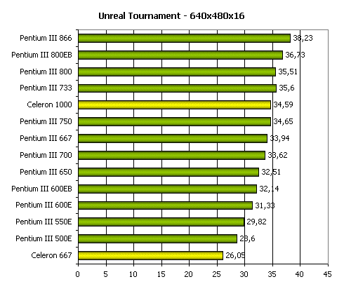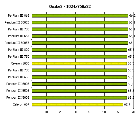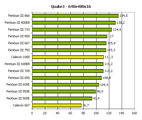 Уменьшение разрешения в Unreal Tonament качественно результатов не изменяет: снова Celeron 667 отстает от Intel Pentium III 500E, а Celeron 1000 работает чуть быстрее Intel Pentium III 667.