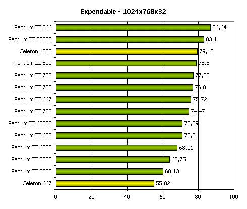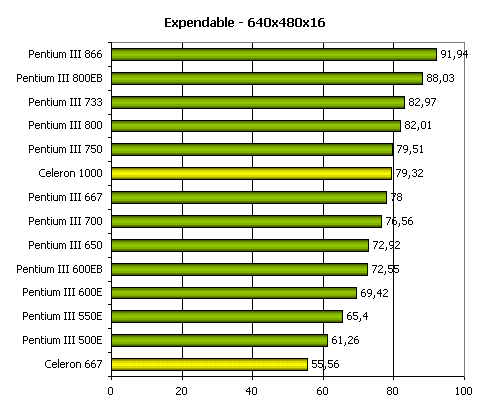 Производительность в Expendable сильно зависит от быстродействия подсистемы памяти. Поэтому, Celeron 566 отстает от Pentium III 500 почти на 16%. Зато разгон Celeron повышением частоты системной шины до 100 МГц приносит несколько большие плоды, чем в предыдущих случаях — скорость Celeron 1000 находится между быстродействием Intel Pentium III 733 и Pentium III 800B.