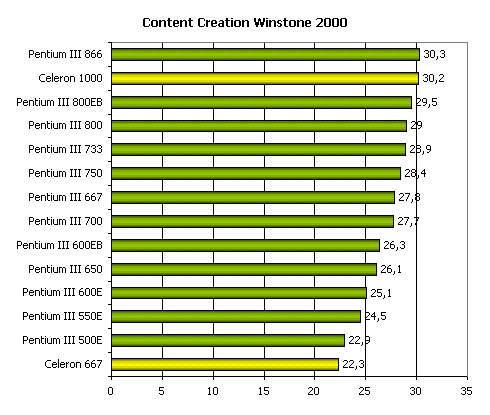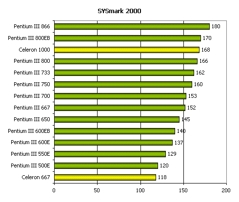 Ситуация повторяется. Медленная шина и уполовиненный L2 кеш не дают Celeron 667 догнать даже Pentium III 500. Да и гигагерцовый Сeleron выглядит в SYSmark не так впечатляюще, как в предыдущем тесте — его производительность оказывается даже ниже чем у Intel Pentium III 800B. Дело тут, вероятно, в том, что SYSmark использует более ресурсоемкие приложения, поэтому процессор с меньшим объемом L2 кеша проигрывает сильнее.