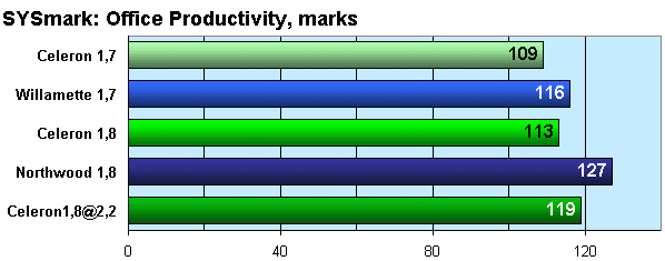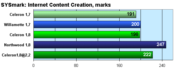 Результаты SYSmark интересны не только тем, что Willamette обходит стартовавший на 100 МГц выше Celeron, но и первой абсолютной победой ядра Northwood. Даже более чем 20-процентного разгона не хватило Celeron для того, чтобы затмить большой кэш процессора на этом ядре в обильно нагружающем процессор, шины и память тесте.