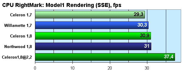 При рендеринге же кэш начинает играть свою роль, что заметно на паре Willamette-Celeron, а вот Northwood почти не оторвался от соперника. Наверное, тут сыграла свою роль скорость работы кэша второго уровня, которая у Northwood чуть пониже, чем у ядра Willamette, и которая то ли сгладила эффект от большего объема этого кэша, то ли объем более 256 КБ вообще не задействуется эффективно блоком визуализации. В любом случае влияние иных, кроме частоты процессоров, факторов на тест минимально, и в обоих блоках вычислений победу с большим отрывом одерживает разогнанный до 2,2 ГГц вариант Celeron.