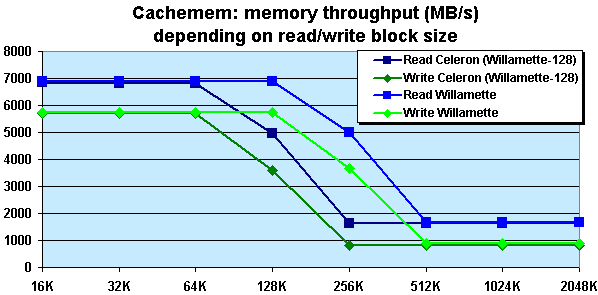 но чтобы все же наглядно продемонстрировать вам наличие у исследованного процессора кэш-памяти второго уровня объемом более 64 и менее 256 КБ, мы отобразили на диаграмме скорость чтения/записи памяти программой Cachemem.