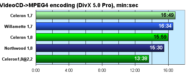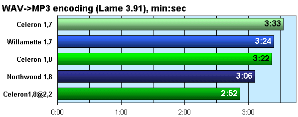 Кодирование MP3 тоже задача счетная, и как видите, даже больший кэш не помогает Pentium 4 «Willamette» отыграть отставание в 100 МГц. Зато за счет этого большего кэша Northwood сильнее отрывается от равночастотного Celeron, чем Willamette от своего.