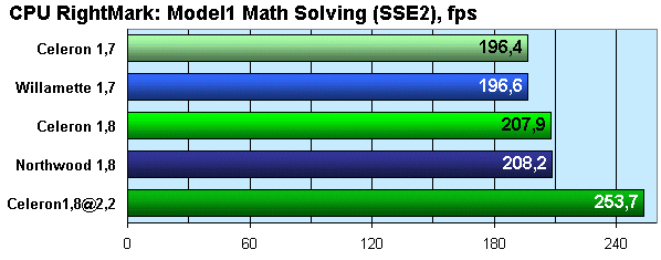 При тестировании в CPU RightMark мы вновь по вполне очевидным причинам ограничиваемся рассмотрением результатов, полученных с применением наборов инструкций SSE/SSE2. В силу алгоритма блока решения уравнений, не требующего обмена большими объемами данных с памятью, размера кэша нового процессора хватает с лихвой, так что производительность зависит строго от частоты.