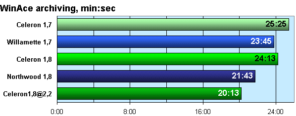 Ну уж в операциях архивирования сам бог велел проявляться эффекту от размера кэша, и эффект налицо. Willamette опережает равночастотный Celeron на 7%, а Northwood на все 12! Отметим, однако, что и в этом случае разгон системы (здесь в первую очередь влияет разгон памяти) позволяет удержаться Celeron@2,2 на позиции лидера.