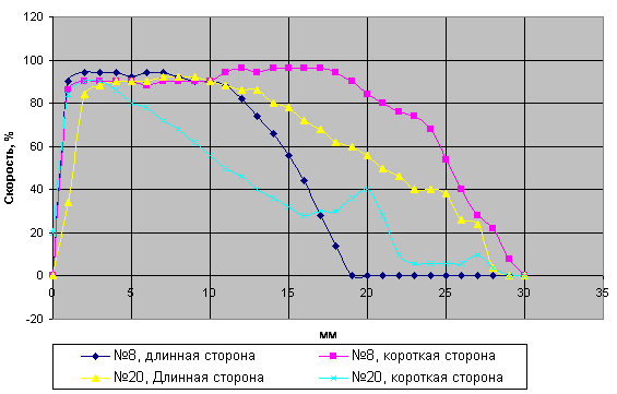 Отметим, что значение скорости в точке 20 мм щели №20 не ошибка эксперимента, какой-то эффект, связанный с изготовлением данного кулера.