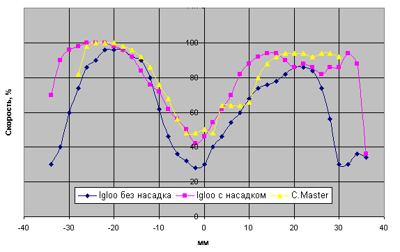 Отметим, что минимум скорости в центральной зоне вентилятора несколько смещен относительно оси его вращения и его положение зависит от направления вращения ротора вентилятора. Если он вращается против часовой стрелки, то смещение происходит налево, если по часовой, то направо. Так что в нашем случае конструкторы все сделали правильно, молодцы, не перепутали. В точке Х=0 мы имеем скорость воздуха 30%, т. е. 0,6 м/с (вся шкала 100% 2м/с), в точке Х=+6 мм 54% (1,08 м/с), а точке Х= -6 мм мы имели бы всего 54% (0,72 м/с). Правда, если бы сдвинули на –18 мм, то имели бы 1,92 м/с, то есть более чем в три раза выше, чем в центре. Кстати заметим, что применение насадка дает почти туже эффективность, что и сдвиг, при Х=0 скорость равна 46% (0,92 м/с), чуть меньше, чем при сдвиге на 6 мм без насадка.