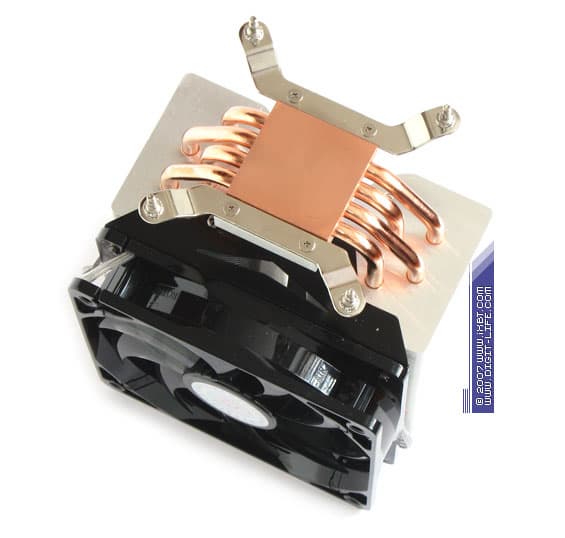 Между тем, один не очень приятный штрих в техническом имидже крепыша Hyper 212 все-таки присутствует: если сопряжение медного теплосъемника с тепловыми трубками выполнено честной пайкой, то контакт пластин оребрения с трубками осуществлен уже только «насухо» — простым обжатием. И хотя этот момент вряд ли следует считать определяющим (пластины на поверку обжаты плотно и аккуратно), очевидно, что пайка могла бы принести гораздо большие дивиденды в деле минимизации контактного термического сопротивления участков сочленения оребрения и тепловых трубок.