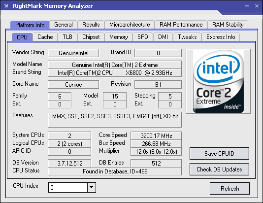Теперь перейдем к собственно соперничеству описанных выше «экстремальных» кулеров за градусы (напомним — нам надо не более 60 ;)) топового нынче интеловского настольного процессора Intel Core 2 Extreme X6800. И чтобы задачка не показалась этим красавцам слишком легкой, мы ее немного усложним, переведя наш экстремальный процессор на одну ступень частоты выше — пусть наш герой работает на 3,20 ГГц (при штатной частоте системной шины 1067 МГц, см. скриншот),