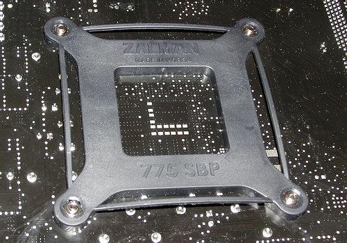 Прижим кулера к процессору весьма сильный, но плата при этом искривляется незначительно. Кулер допускает установку в любой из четырех пространственных ориентаций (при этом в «верхней» рамке есть выем для откидного рычажка разъема LGA775),