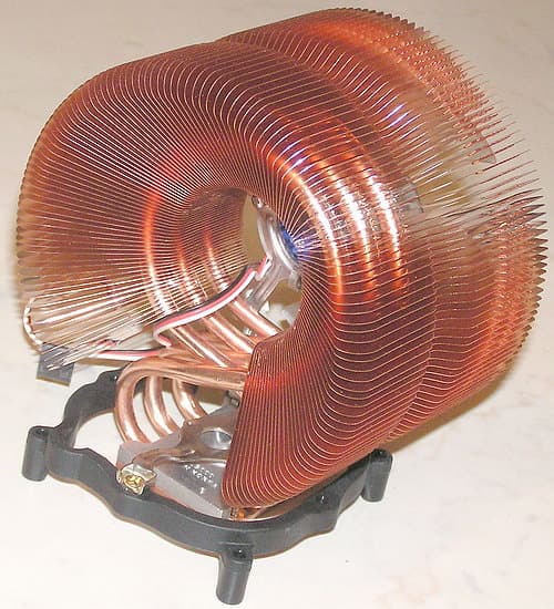 Диаметр радиатора 9700-го возрос с 11 до 13 см, длина увеличилась где-то на сантиметр, высота — сантиметра на два, да и тепловые трубки стали чуть толще. По-прежнему, секция медных пластин толщиной 0,2 мм образует хорошо продуваемый радиальный «веер» с большой площадью поверхности теплообмена (5490 кв.см, что почти в полтора раза больше, чем у 9500-х), причем интенсивно работает практически вся эта поверхность — как в центре («кольца» термоконтакта с трубками), так и на внешнем радиусе.