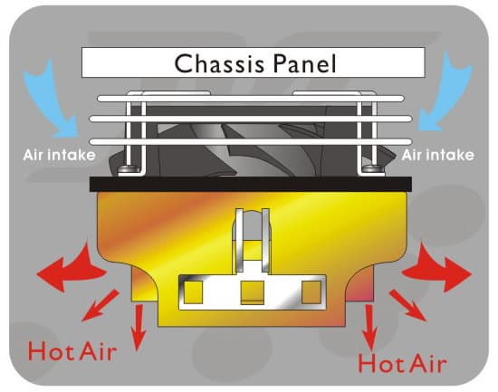 Другое прогрессивное решение — безрамочный вентилятор (сверху и по бокам — только тонкая проволочная решетка). В результате, кулер отлично подходит для slim-систем с ограниченной толщиной корпуса, где основной воздухозабор осуществляется не с фронтальной части, а с боков кулера (см. схему выше).