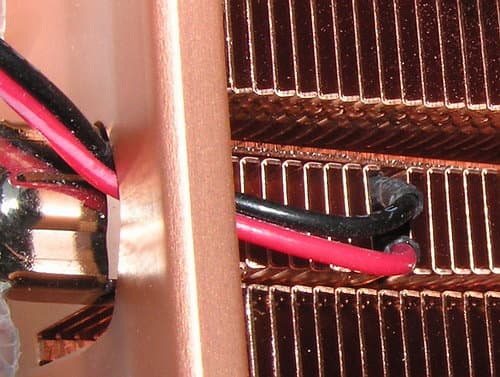 Это позволяет более грамотно и оптимально управлять скоростью вращения вентилятора, см. выше (регулировка по температуре нагнетаемого у в кулер воздуха часто вызывает немалые нарекания и не обеспечивает должной эффективности и тишины охлаждения). К сожалению, чувствительная головка термодатчика, как оказалось, касается не самого медного основания кулера (чтоб было бы наиболее правильно), а лишь тонкого ребра радиатора на расстоянии примерно 12 мм выше радиатора, то есть измеряет заведомо более низкую температуру. Будем надеяться, что схема управления, это учитывает. :)