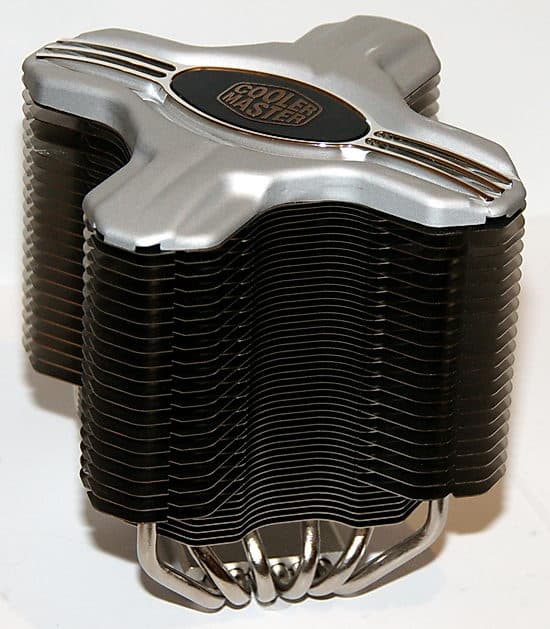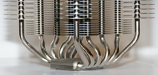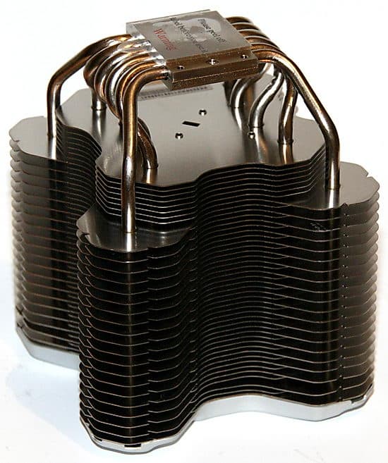 Радиатор изделия состоит из 20 больших и 27 малых алюминиевых ребер крестообразной формы толщиной 0,5 мм. Ориентировочная поверхность теплорассеивания (производителем не указывается, поэтому посчитана мной с линейкой «на глазок») составляет 2×27×9,2×9,2 + 2×20×11×11=(как там у Райкина — два пишем, семь на ум пошло?)= 9400 см². Весьма внушительная цифра, учитывая примерно вдвое меньшие значения для продвинутых активных кулеров конкурентов. Ребра отстоят друг от друга достаточно далеко, чтобы не затруднять естественный воздухоток и не собирать пыль хлопьями. Производитель утверждает, что форма ребер радиатора «аэродинамическая», то есть воздушный поток проходит между ними более быстро, нежели «обычно»: крестообразная форма ребер способствует снижению тылового давления воздуха, а оптимальный зазор между ними улучшает воздухоток.