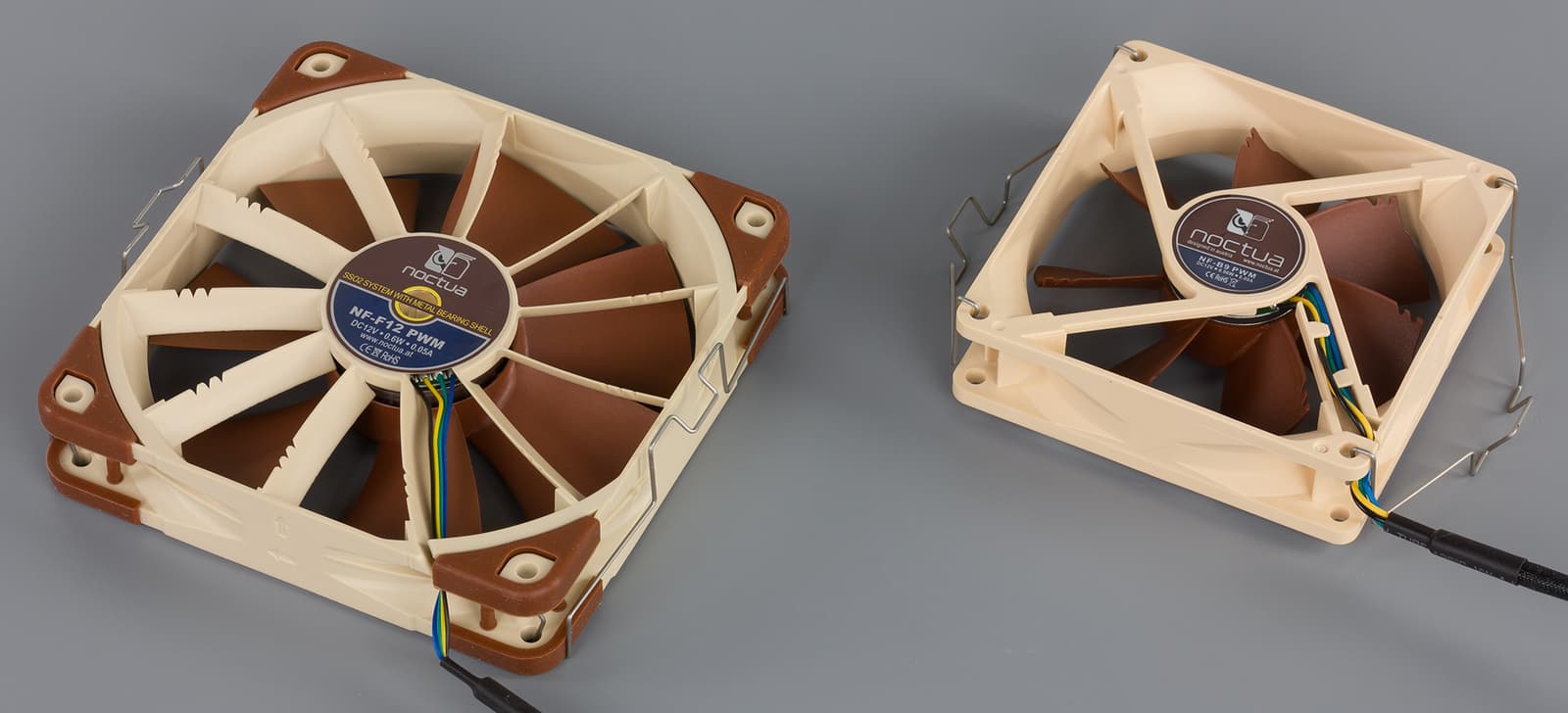В этой модели используются два разных вентилятора — Noctua NF-B9 диаметром 92 мм и Noctua NF-F12 диаметром 120 мм со скоростью вращения от 300 до 1600 и 1500 об/мин соответственно. При использовании специального адаптера Low-Noise Adaptor (LNA) из комплекта максимальные обороты можно снизить до 1300 и 1200 об/мин. Согласно спецификации, максимальный воздушный поток, создаваемый вентиляторами, составляет 64,3 и 93,4 м³/ч соответственно. В обоих вентиляторах применяется самостабилизирующийся гидродинамический подшипник на магнитном подвесе (SSO Bearing). Но если Noctua NF-B9 базируется на первом поколении таких подшипников, то Noctua NF-F12 работает на подшипнике второго поколения SSO2-Bearing. К настоящему моменту это одни из лучших подшипников, так как модели кулеров, построенные на их основе, обладают низким уровнем шума и внушительным сроком службы (производитель заявляет время работы на отказ около 150 000 часов). Производитель также приводит данные об уровне шума до 17,6 и 22,4 дБА соответственно. Каждый из вентиляторов имеет 4-контактный разъем для подключения к плате. В комплекте кулера есть специальный Y-разветвитель с 4-контактным разъемом на конце для подключения обоих вентиляторов к одному разъему на системной плате. Стоит отметить, что в этом случае на системную плату приходит сигнал тахометра только с одного из вентиляторов.