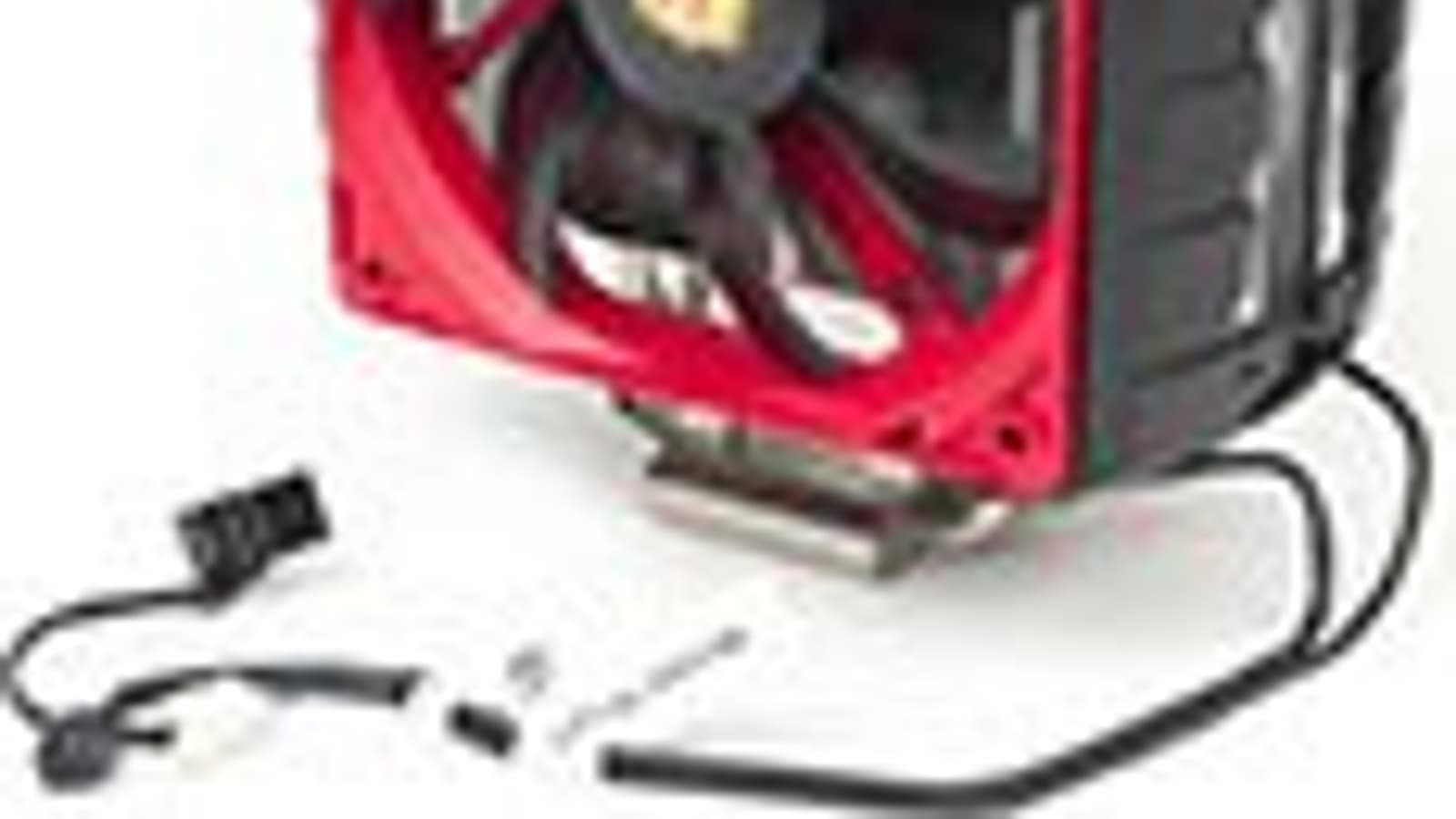 Воздушный поток создают два 120-миллиметровых вентилятора. Крепление вентиляторов на кулере обеспечивает пластиковый кожух, который достаточно легко «защелкивается». В этом плане установка кулера не вызывает негативных эмоций. Также похвально наличие регулятора оборотов, позволяющего ограничить частоту вращения в диапазоне от 1000 до 2000 об/мин.