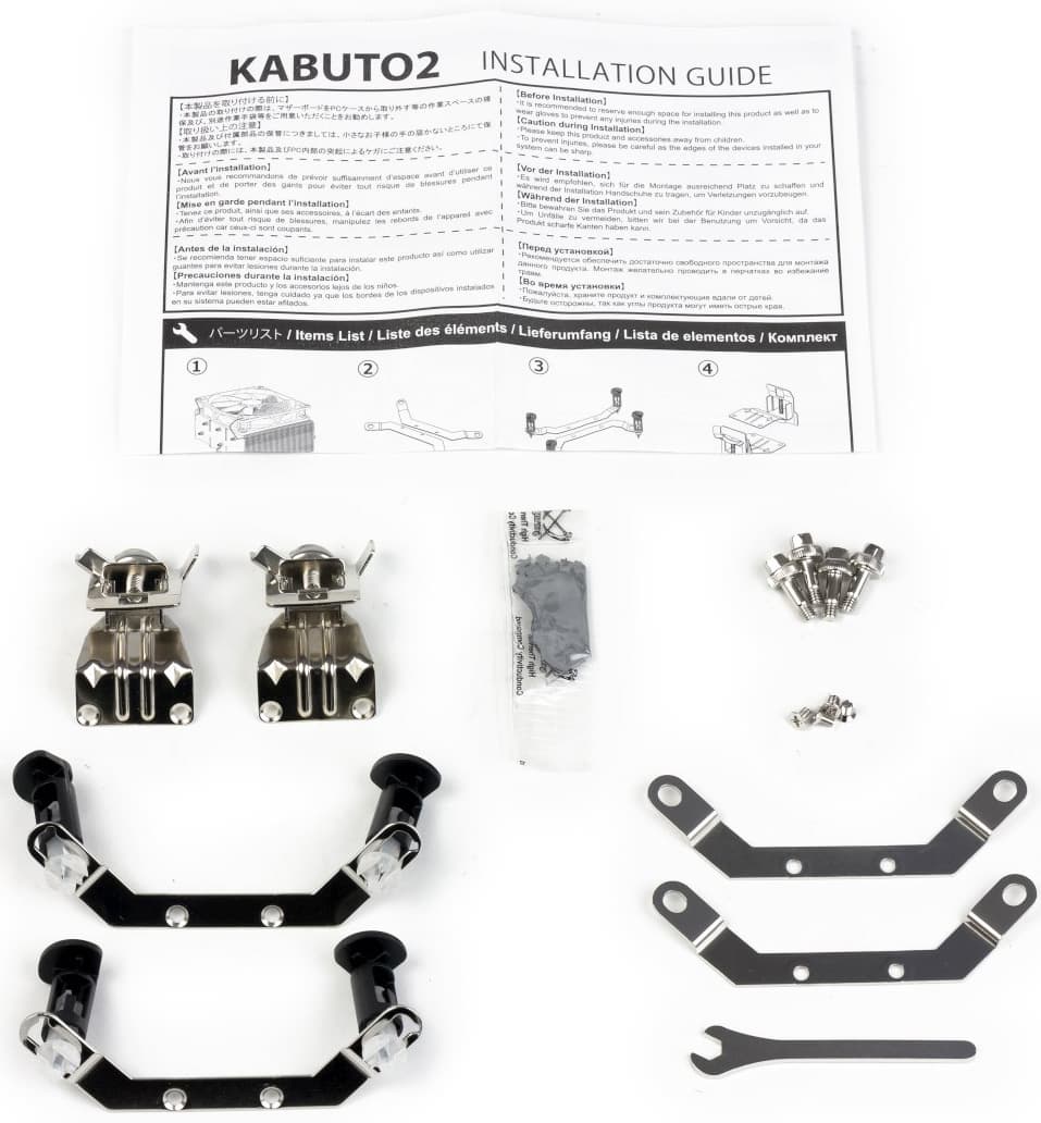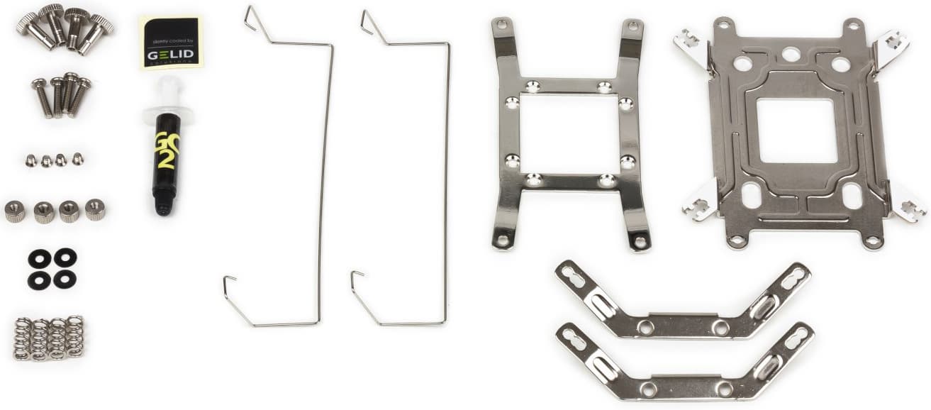В комплекте помимо стандартного набора элементов крепежа, рассчитанного на все актуальные в настоящее время процессорные разъемы, имеется переходник-ограничитель частоты вращения вентилятора. При его использовании обороты снижаются более чем вдвое.