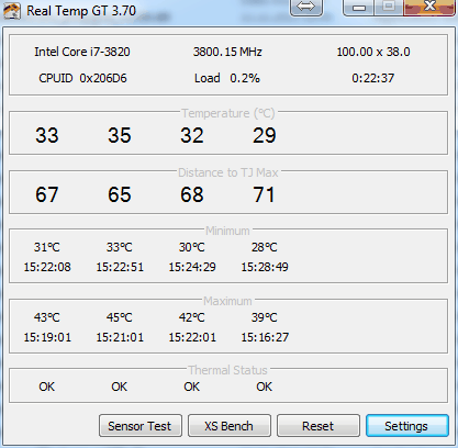 Температура процессора контролировалась с помощью утилиты Real Temp GT 3.7. Процессор в режиме максимальной нагрузки разогревался до тех пор, пока его температура не стабилизировалась (от 5 до 15 минут). В режиме простоя, то есть когда процессор нагружен не более чем на 3-4%, данные температуры снимались по истечении 10-25 минут. Поскольку утилита показывает температуру для каждого из ядер, за общую температуру мы берем среднее (среднее арифметическое) значение по всем четырем ядрам на момент измерения.