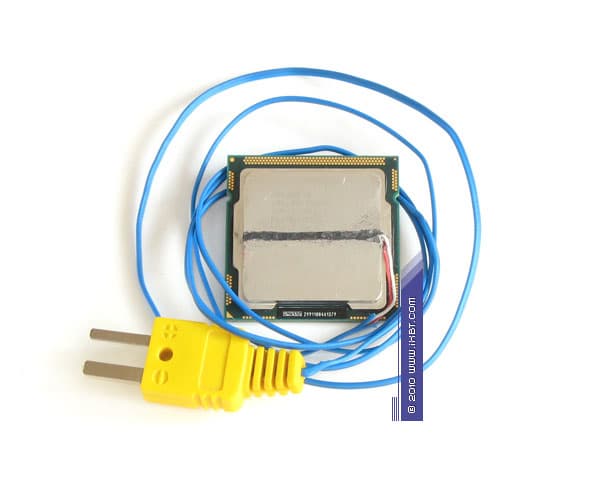 Сказано сделано! Так как нашей задачей является сравнительное тестирование кулеров (а не проверка соответствия их характеристик нормативным требованиям, для чего собственно и предназначен эмулятор TTV), мы взяли «живой» процессор Xeon X3450 (любезно предоставленный на опыты самой компанией Intel) и произвели вивисекцию над его теплорассеивателем был сделан небольшой распил шириной 1 мм и глубиной 0,5 мм, спай термопары в центре распила был зафиксирован капелькой сплава Розе, а проводка термопары и оставшаяся «половинка» распила были «залатаны» термостойким эпоксидным клеем. В итоге мы получили процессор с независимым термодатчиком, который выполняет «интегральную» оценку температуры на поверхности корпуса то есть воспользовались старым добрым экспериментальным методом, применяемым в радиоэлектронных НИОКР еще с незапамятных времен.