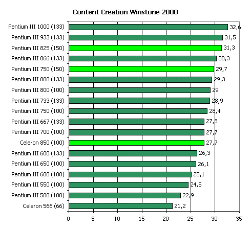 Результаты практически повторяют картину, которую мы видели в предыдущем тесте. Оно и не удивительно: и SYSmark и Winstone используют для измерения производительности наборы офисных приложений. Поэтому снова разогнанный до 750 МГц Pentium III 500 работает со скоростью, близкой к скорости Intel Pentium 800, а разогнанный до 825 МГц Pentium III 550 по производительности соответствует Intel Pentium III 866. И снова результат Celeron 566, функционирующего на 850 МГц при повышении частоты FSB до 100 МГц не так высок — его быстродействие чуть превосходит скорость 100-мегагерцового Intel Pentium III 700 и 133-мегагерцового Intel Pentium III 667.
