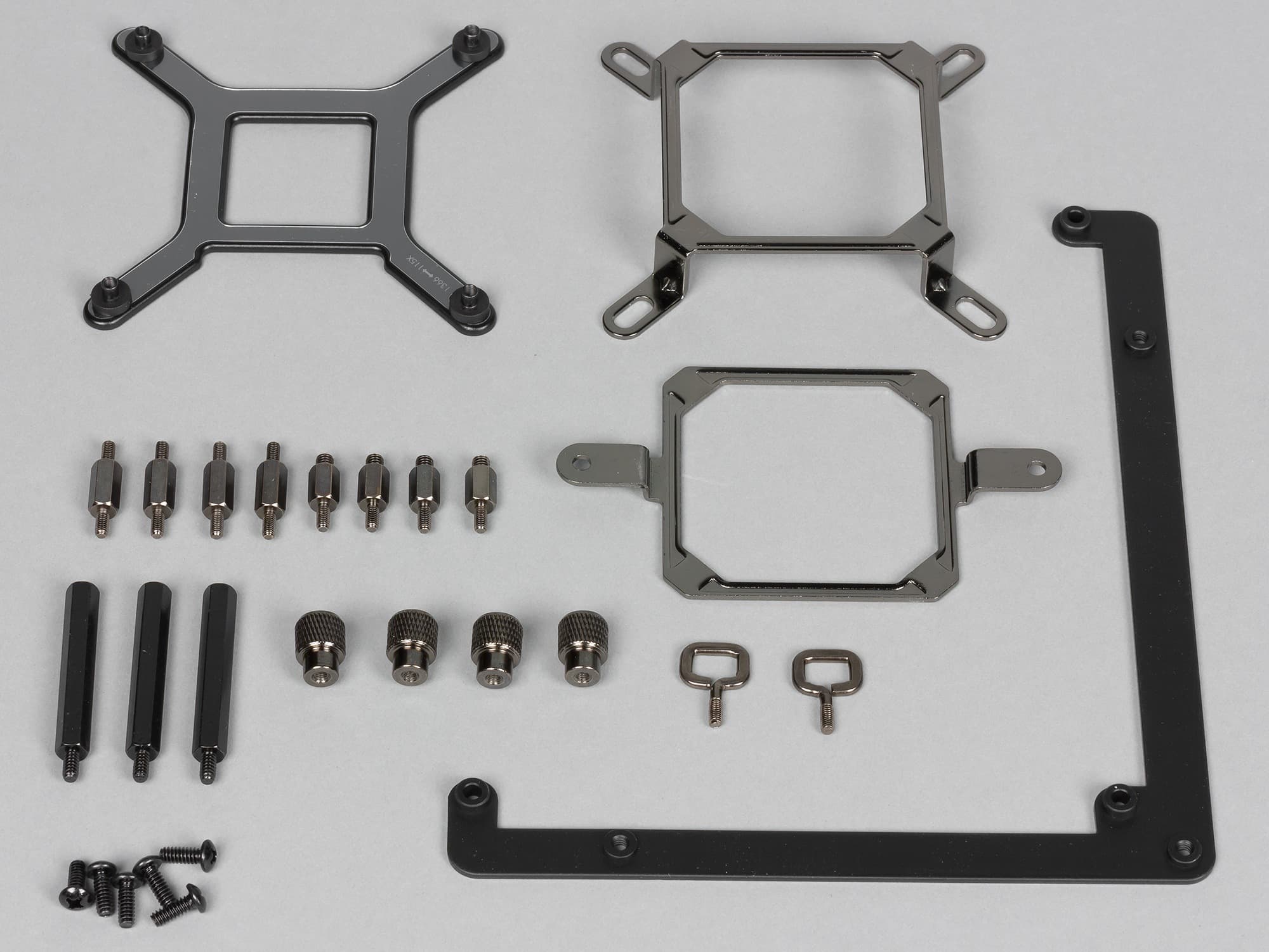 Установка кулера не совсем тривиальная, поэтому уделим ей несколько абзацев. На первом этапе в корпус нужно установить материнскую плату (в зависимости от процессора — уже с рамкой на обратной стороне), при этом три посадочных отверстия на ней используются также для установки Г-образной рамки из комплекта кулера. Подключаются все провода к материнской плате, на процессоре закрепляется помпа, в рамку вворачиваются три длинные стойки, а на них закрепляется радиатор кулера в сборе с кожухом вентилятора. Так это выглядит на мат. плате вне корпуса: