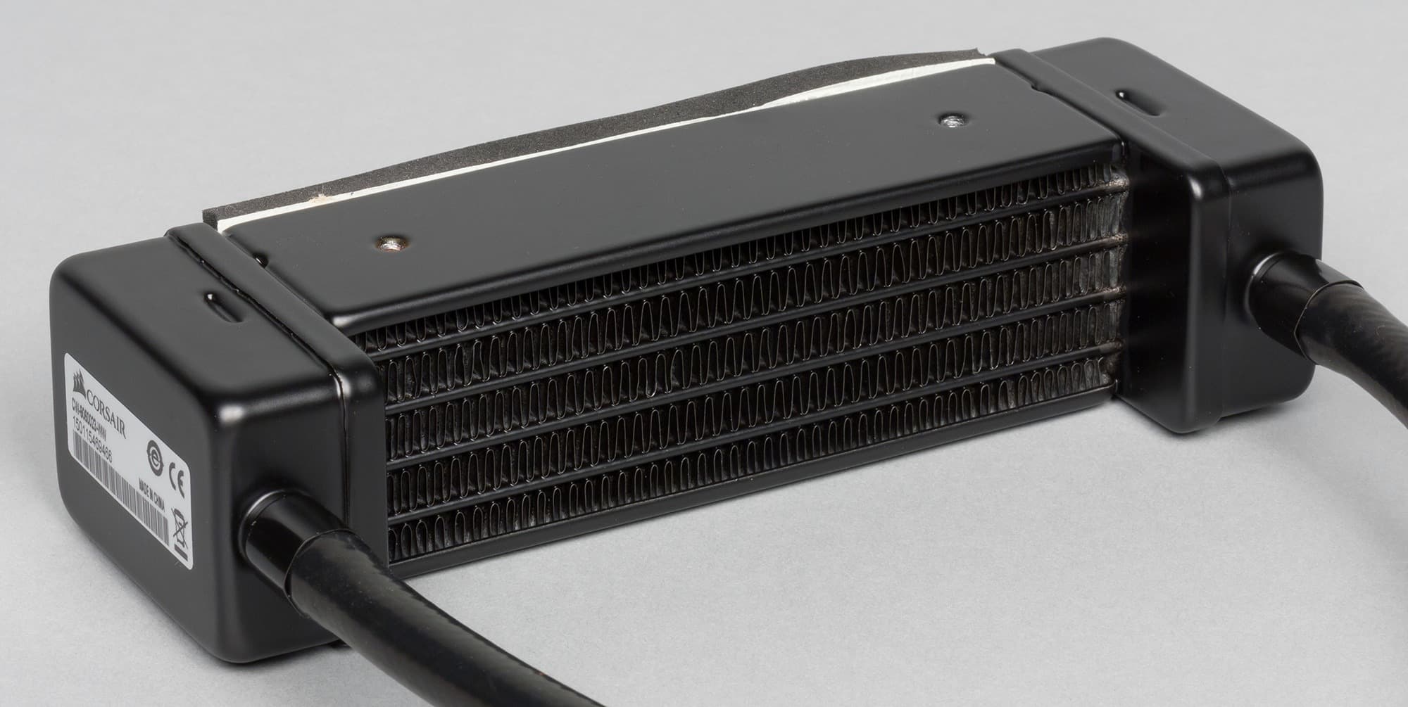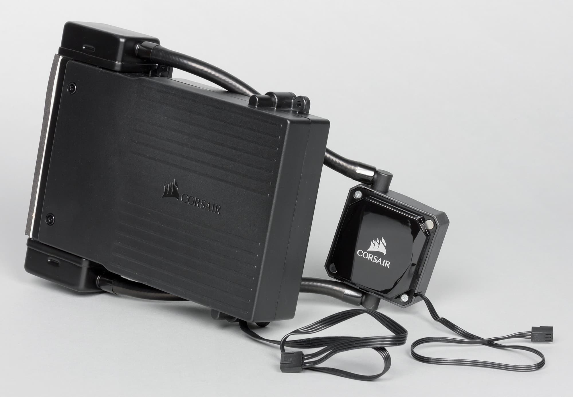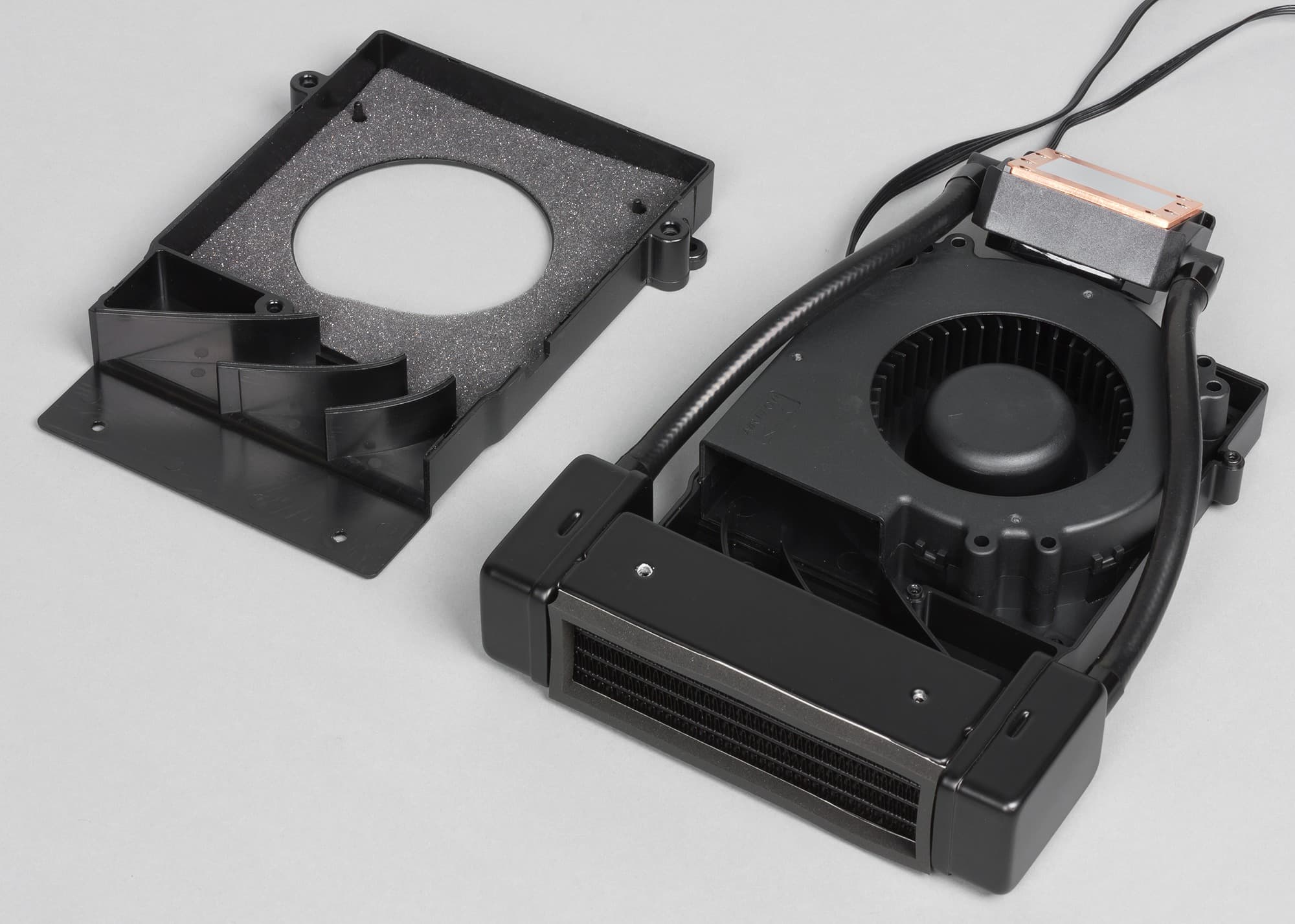 На торце корпуса помпы можно обнаружить пробку, видимо, для заправки охлаждающей жидкостью. Г-образные штуцеры, выходящие из помпы можно вращать без ограничений относительно корпуса самой помпы. Это, как и гибкие шланги, существенно облегчает установку кулера. Части шлангов, не скрытые гильзами, имеют длину в примерно 150 мм. Рабочий просвет радиатора — 121 на 33 мм при толщине примерно 35 мм.