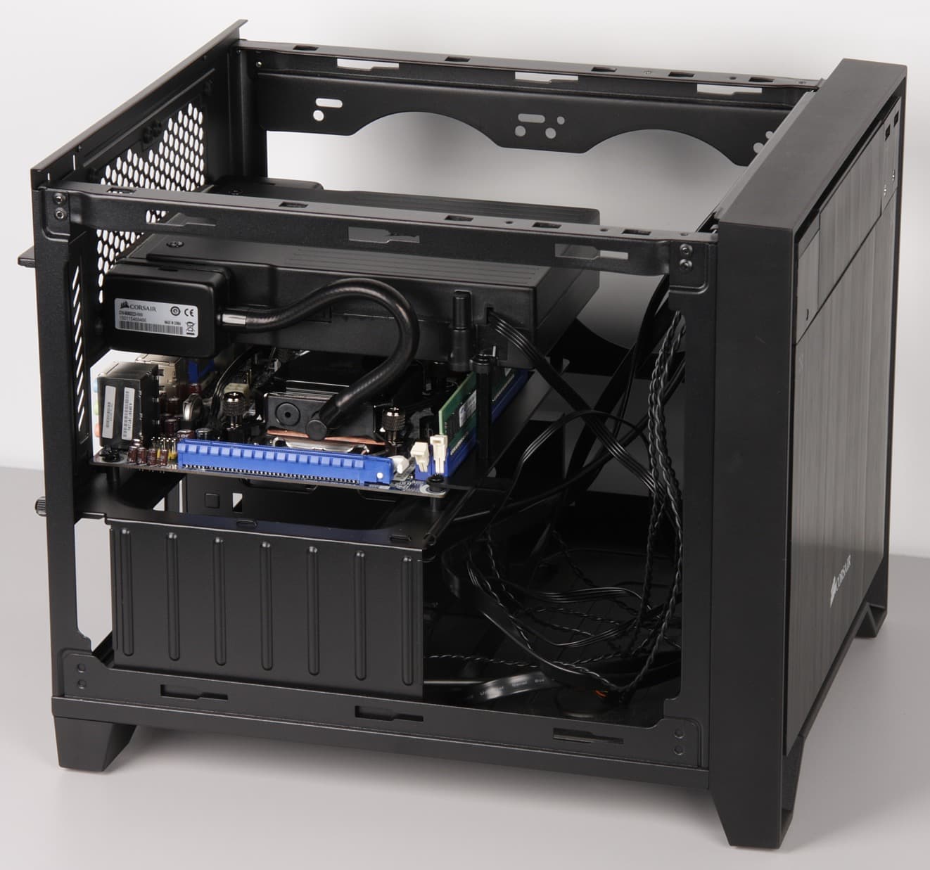 Для демонстрации мы использовали корпус Corsair Obsidian 250D. Он, конечно, не совсем отвечает концепции того компактного корпуса, для которого предназначена рассматриваемая система охлаждения, но особенности размещения кулера выявить поможет. Прежде всего, кулер должен поместиться в корпус. В данном случае расстояние от поверхности пластины, к которой прикручивается мат. плата, до верхней точки кулера равно 98 мм.