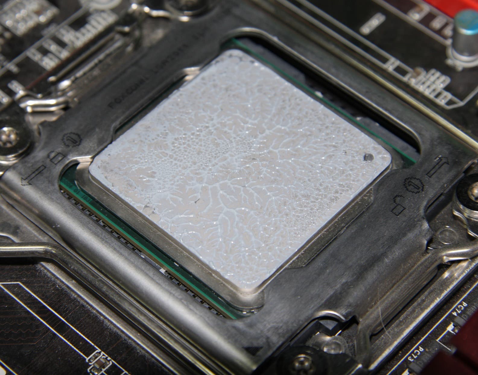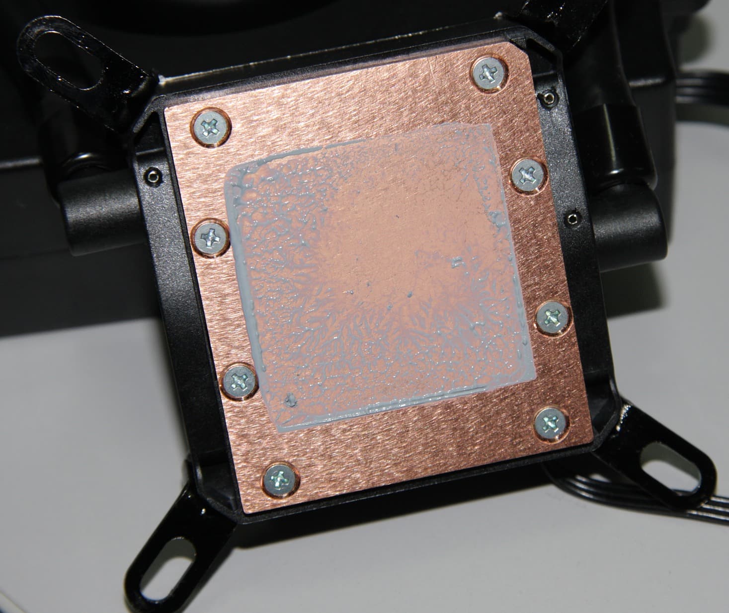 Видно, что термопаста распределилась равномерно по всей плоскости крышки процессора, а на подошве помпы контакт с крышкой процессора, несмотря на небольшой перекос при установке, остался на участке с ровной поверхностью, то есть не заходит на отверстия под винты.