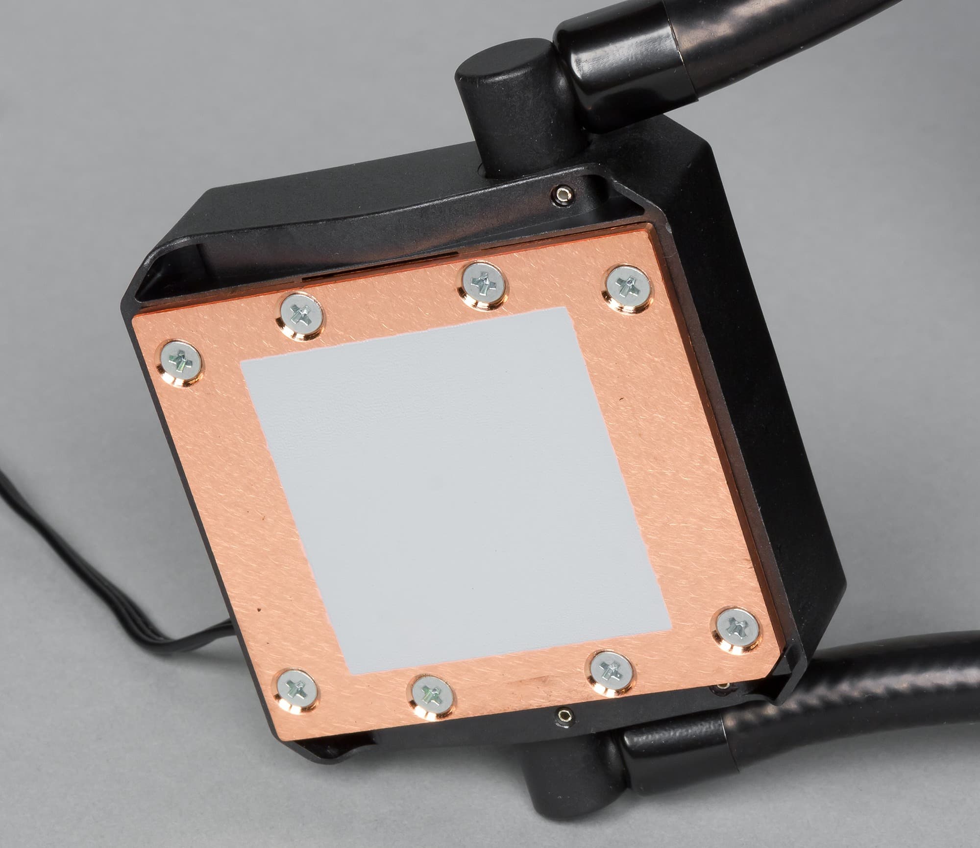 Система герметичная, заправлена и готова к использованию. Помпа интегрирована в один блок с теплосъемником. Подошвой теплосъемника, непосредственно прилегающей к крышке процессора, служит медная пластина. Ее внешняя поверхность ровная и гладкая, но не отполирована до зеркального блеска.