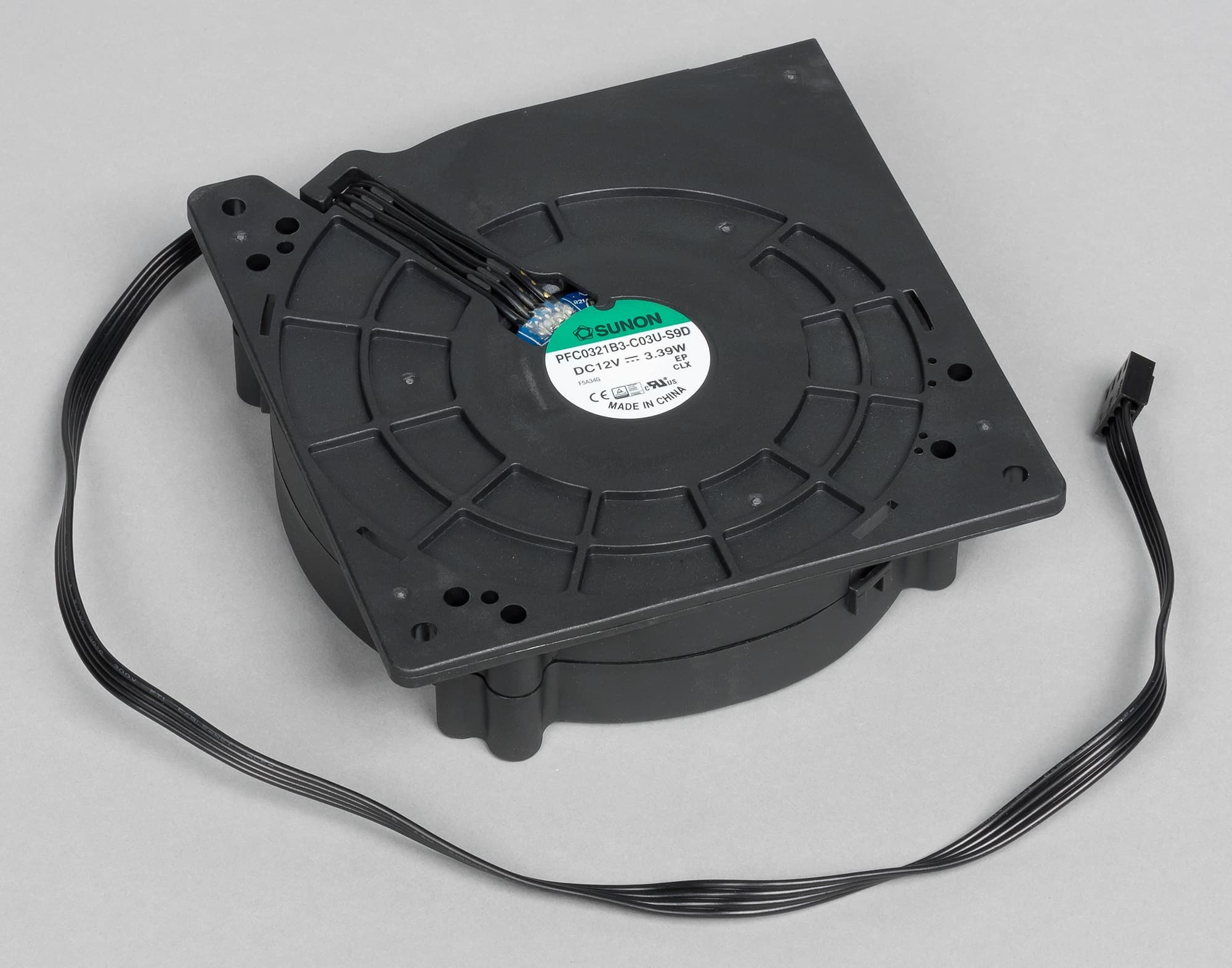 Забирается воздух через круглое отверстие в кожухе снизу (изнутри корпуса) и выдувается через радиатор (наружу). Кожух скрывает относительно большой центробежный вентилятор-улитку. Между кожухом и корпусом вентилятора проложены виброизолирующие прокладки из пенополиуретана. Как можно увидеть, выходное отверстие вентилятора меньше рабочего просвета радиатора, поэтому для более равномерного распределения воздушного потока используются криволинейные направляющие.