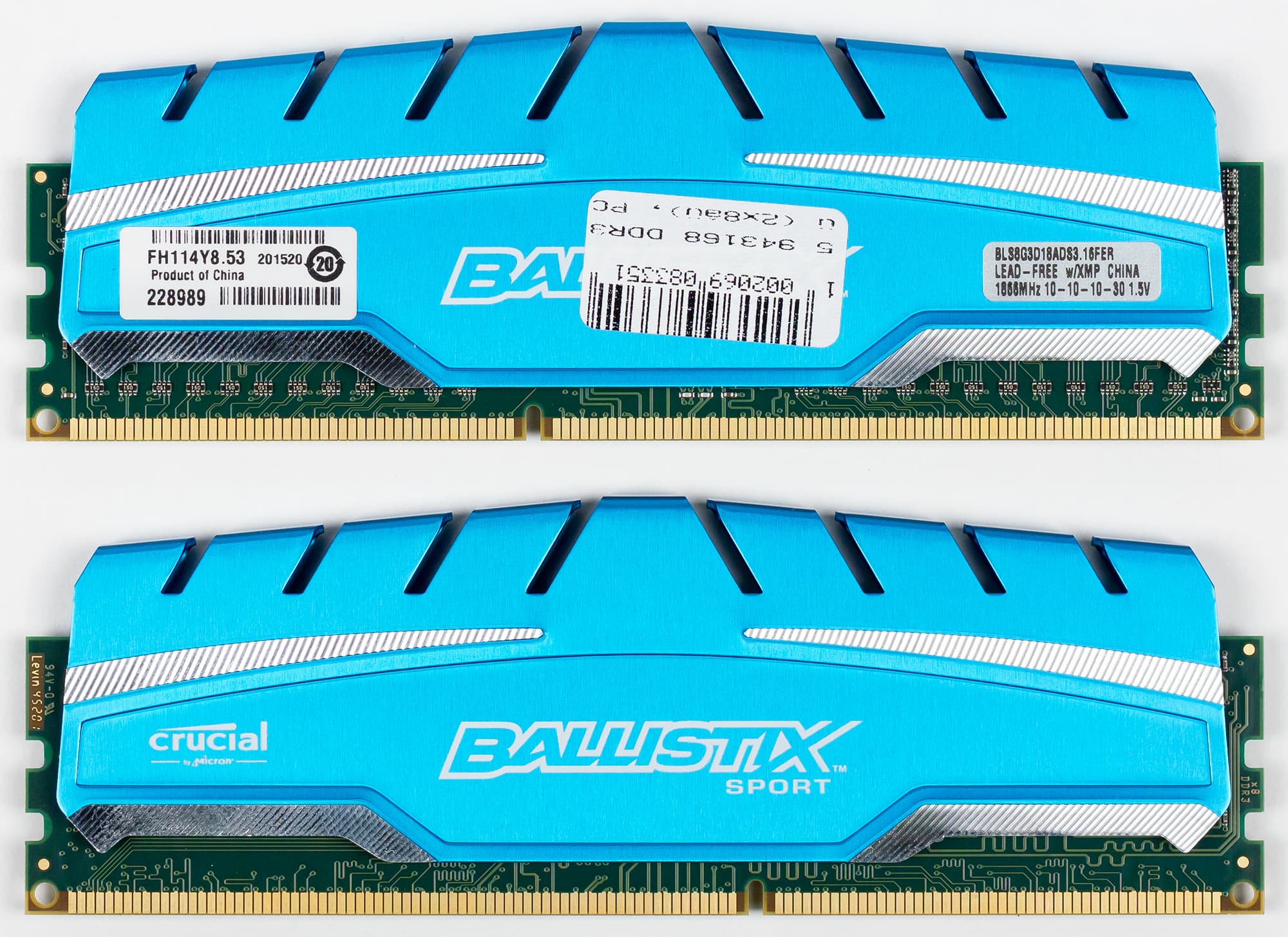 Эти модули памяти имеют маркировку BLS2K8G3D18ADS3. Видимо, BLS — это обозначение серии Crucial Ballistix Sport. 2K8G означает, что это комплект из двух модулей по 8 ГБ, 3D отражает тот факт, что речь идет о памяти DDR3, а 18 — это частота 1866 МГц. Смысл остальных букв и цифр остается загадкой.