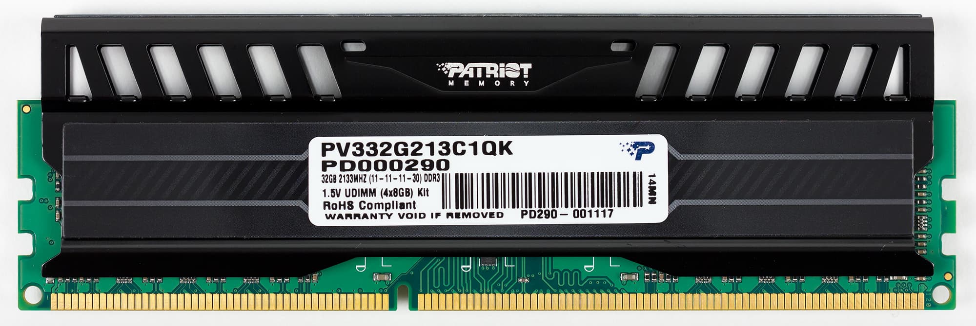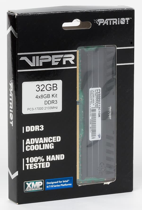 Комплект памяти Patriot Viper 3 DDR3-2133, который побывал у нас на тестировании, представляет собой, как уже отмечалось, набор из четырех модулей суммарным объемом 32 ГБ (4 × 8 ГБ), но при тестировании мы использовали лишь два модуля из этого набора, дабы уровнять его с остальными испытуемыми.