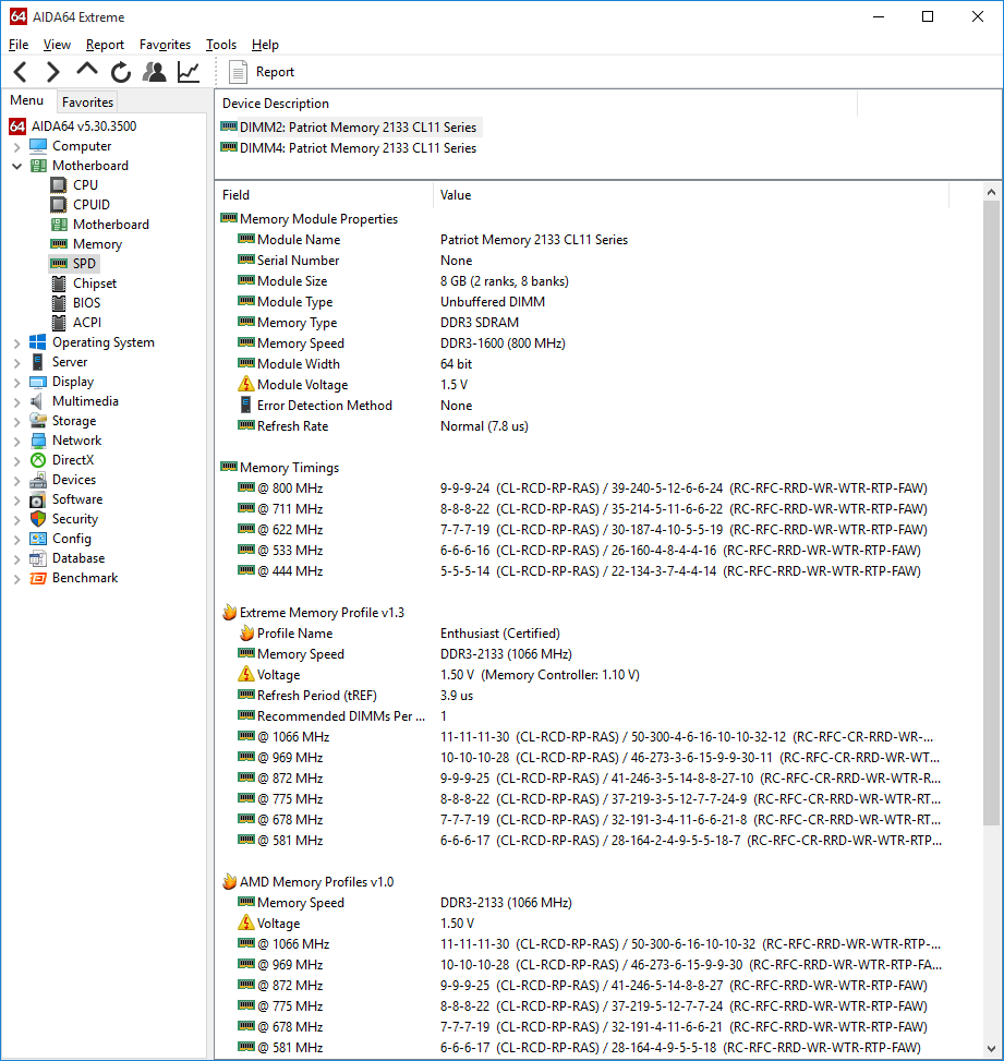 Согласно спецификации, эти модули поддерживают работу на частоте 2133 МГц при напряжении питания 1,5 В и таймингах 11-11-11-30. Заявленные характеристики реализуются через XMP-профиль, а настройки по умолчанию, прописанные в SPD, следующие: DDR3-1600 с таймингами 9-9-9-24.