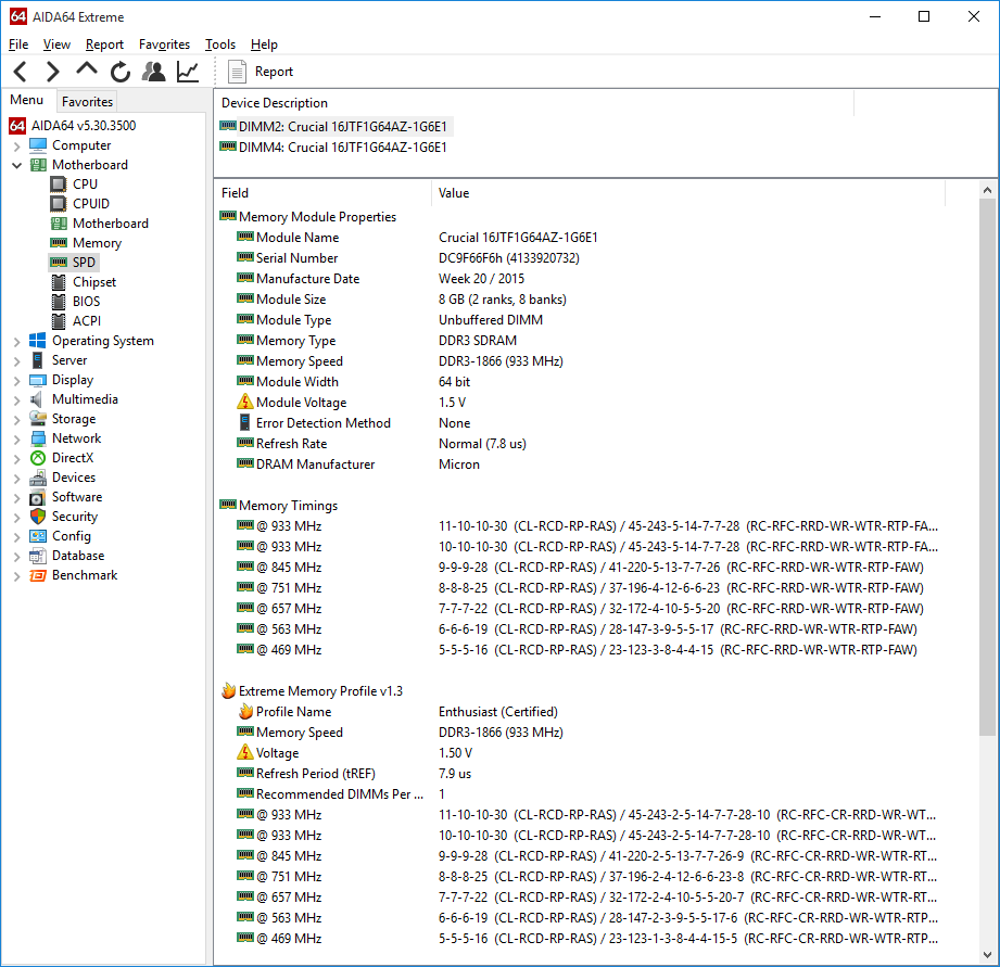Интересно отметить, что утилита AIDA64 считывает немного иную информацию об этих модулях памяти: Crucial 16JTF1G64AZ-1G6E1. Что означает данная аббревиатура и почему утилита именно так определяет эту память, можно лишь гадать.