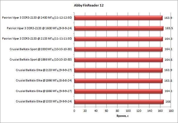 Время выполнения теста на основе приложения Abbyy FineReader 12 практически вовсе не зависит от скорости работы памяти. Тут разница между лучшим и худшим результатами составляет всего 1,3%.