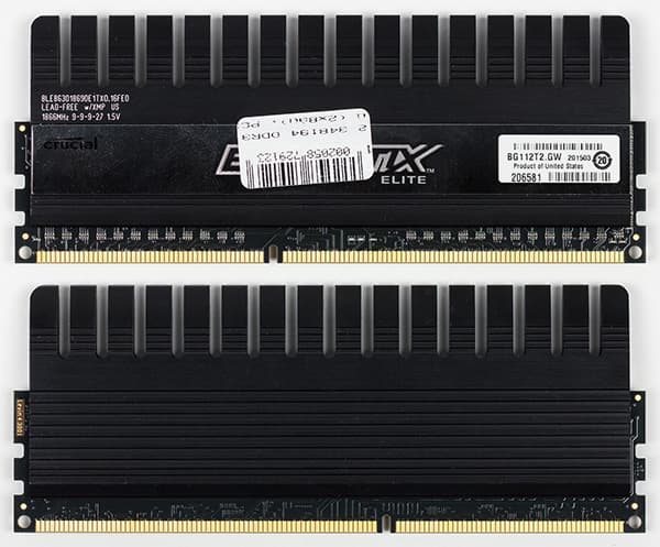 Остается добавить, что модули памяти Crucial Ballistix Elite 16 GB DDR3-1866 имеют фирменные массивные радиаторы черного цвета для эффективного рассеивания тепла, причем высота модуля с радиатором составляет 52 мм, а его толщина — 7,3 мм. Радиаторы представляют собой две металлические пластины толщиной по 1,4 мм, которые прочно приклеены с каждой стороны модуля. Снять радиатор с модуля, не повредив его, довольно проблематично, поэтому информации об используемых чипах памяти у нас нет, однако, судя по информации утилиты AIDA64, речь идет о чипах памяти Micron.