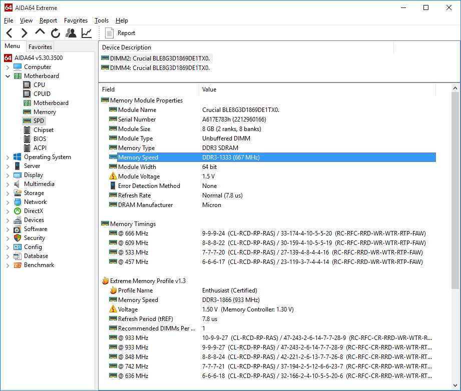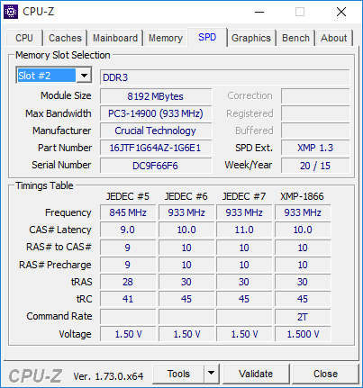 На нашем тестовом стенде память Crucial Ballistix Elite 16 GB DDR3-1866 «завелась» в режиме Auto (без активации XMP-профиля) на частоте 1333 МГц с таймингами 9-9-9-24 при напряжении питания 1,5 В, то есть именно так, как и должна. В SPD этой памяти прописываются именно такая частота и тайминги по умолчанию.