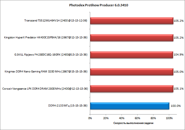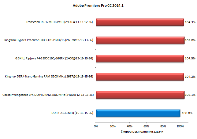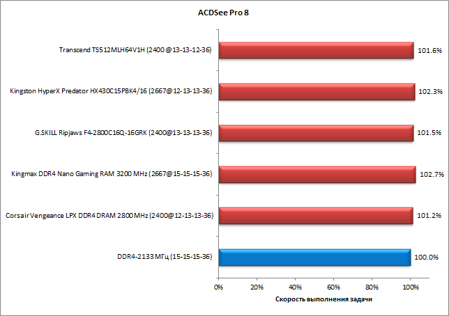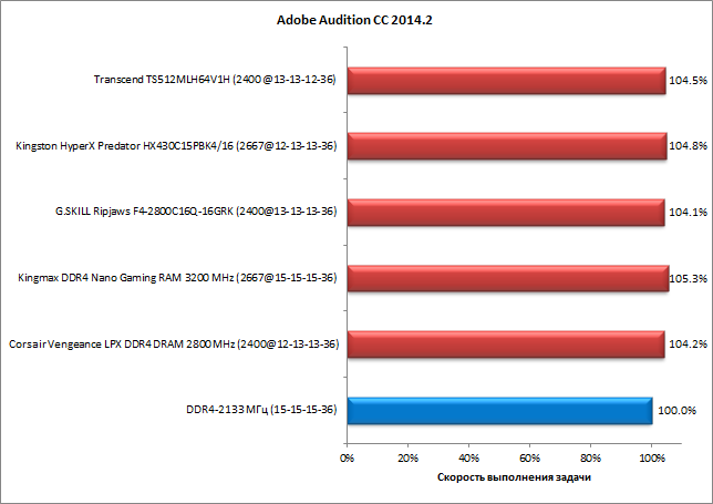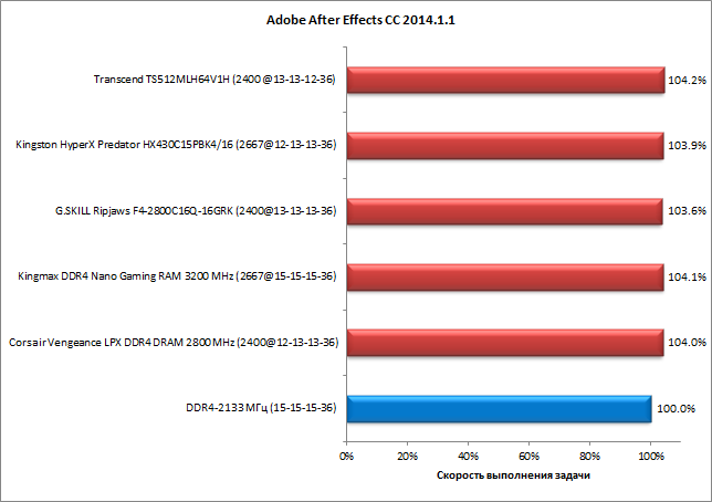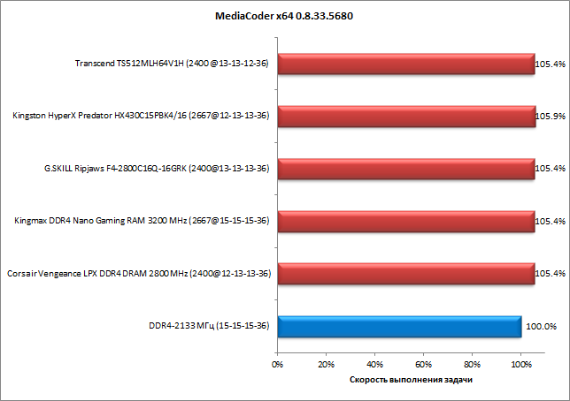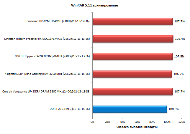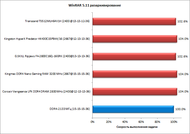 Теперь обратимся к результатам тестирования комплектов памяти в четырехканальном режиме. Результаты представлены на диаграммах, причем для каждого комплекта приведена безразмерная скорость выполнения задачи, выраженная в процентах. За 100% принимается скорость выполнения задачи в режиме DDR4-2133 с таймингами 15-15-15-36.